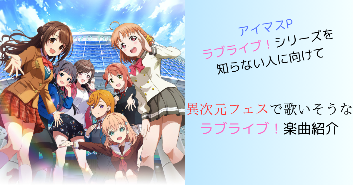 まず、前提として今回は「異次元フェス」に向けてラブライブ!シリーズを見始めるアイマスPに向けての発信なので、今回参加しないμ'sは補足内容として紹介していきます。なので「ラブライブ!」も気になるアイマスPや見始めようとしてる方の参考にもなってます。